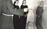 Fra Angjeo Nuić (Drinovci, 1850. - Mostar, 1916.), arheolog, konzervator i utemeljitelj muzeja na Humcu; slika na zidu hodnika Župnog ureda sv. Ante Padovanskog na Humcu.