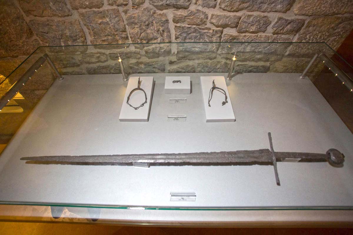 Najbrojniji sredjovjekovni spomenici su nekropole. Manje su poznata groblja prije XII. st. Do sada je istražen manji broj, sučajno otkrivenih grobova, a predmeti u izložbi, koji su uobičajeni inventar tih grobova dospjeli su u muzej bez pobližih podataka o mjestu i okolnostima nalaza. Oni se sastoje od nakita, oružja, opreme i predmeta svakodnevne uporabe. Puno poznatije su nekropole iz razdoblja XIII.- XV. st. zbog svojih nadgrobnih spomenika - stećaka. Stećci su i najvredniji spomenici srednjovjekovne umjetnosti u nas. Od nekoliko desetaka tisuća poznatih spomenika skladnih oblika (ploča, sanduk, sljemenjak križina), velik ih broj u Hercegovini i danas izaziva naše divljenje. Mnogi imaju ukrase geometrijskih, vegetabilnih i arhitektonskih motiva, kršćanskih i heraldičkih simbola, figuralnih predstava i dr., a neki i natpise na hrvatskom jeziku i hrvatskoj ćirilici (bosančici). Otisak jednoga od najvrednijih natpisa na stećcima uopće, postavljen je u ovu izložbu, jedan originalni primjerak, kao i fotografija jedne nekropole i pojedinačni nalazi iz grobova pod njima.